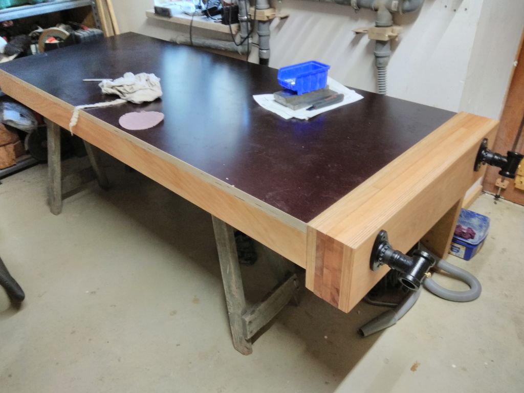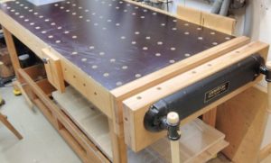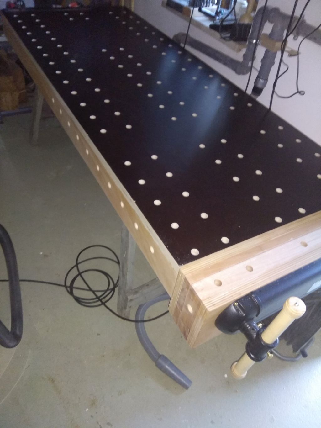 Kann ich sagen, dass es sich gelohnt hat die Werkbank mit der präzisen Vorplanung zu machen. Das mag anders sein wenn man ausreichend Platz hat. Aber auch noch 5 Jahre später freue ich mich immer wieder wenn ich daran arbeite, dass alles passt, nichts nachgibt und immer eine Möglichkeit zum spannen der Werkstücke gefunden wird. Natürlich ist mittlerweile die Arbeitsplatte ordentlich verschrammt, kann aber notfalls getauscht werden – wenn sich jemand findet der unzählige Löcher bohren will.