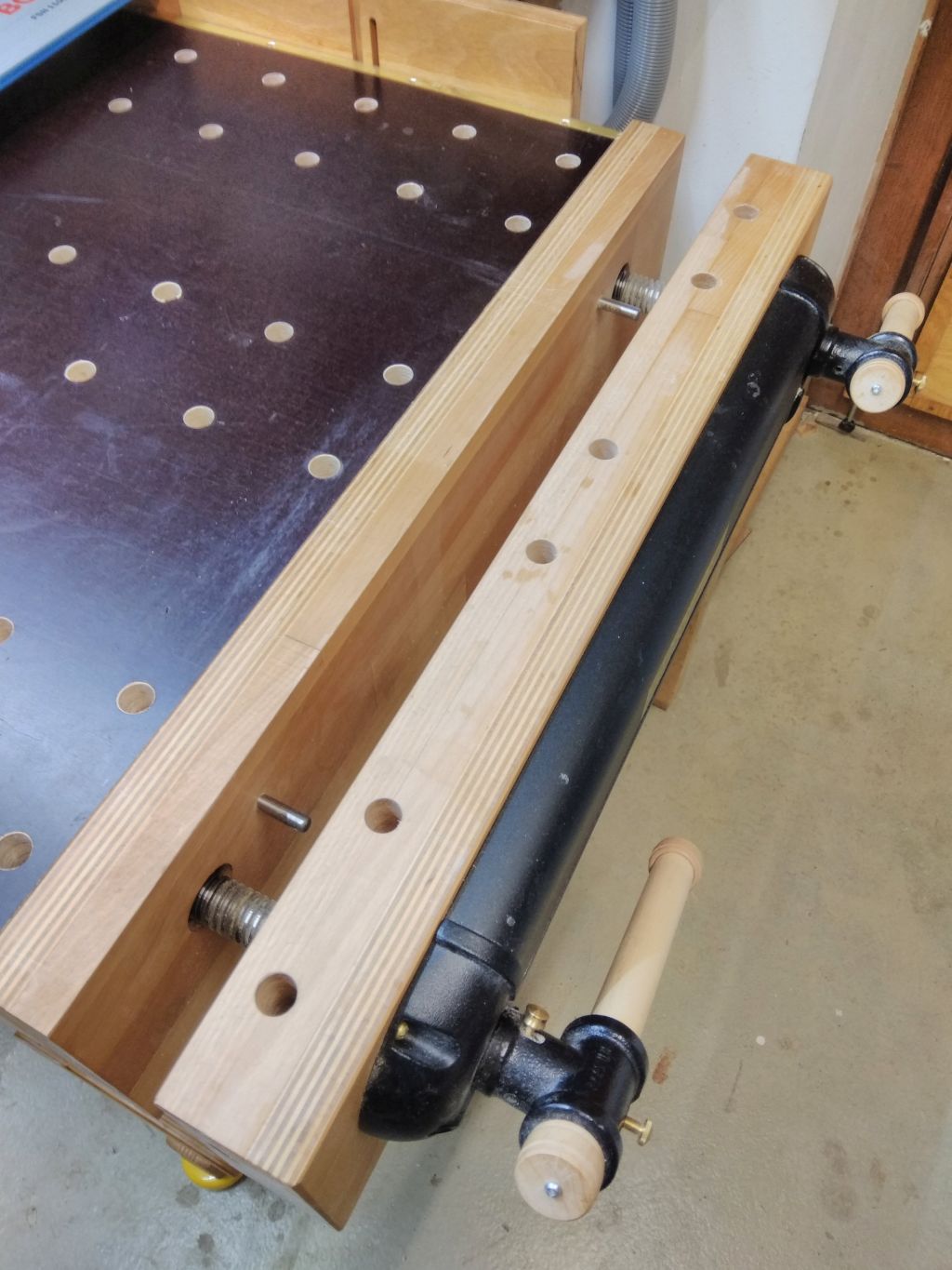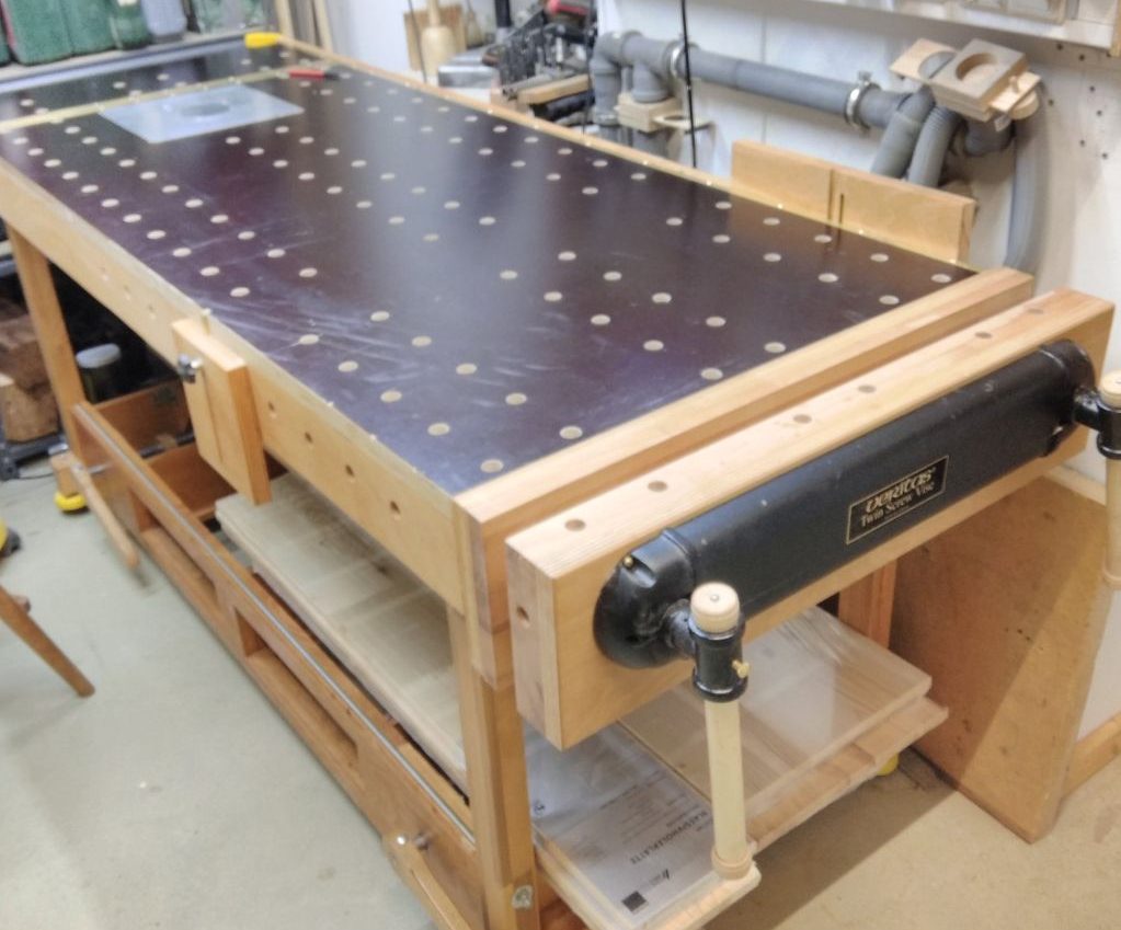Die schöne Veritas Doppelspindel mit mächtiger Buchenbacke und ein haltbare Siebdruckplatte als Arbeitsfläche – Pflicht