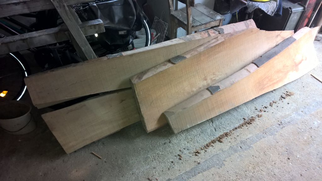 Da ich jetzt gute Platten hatte aber weder Zuschnitt und Platz um mir nach und nach die benötigten Zuschnitte herstellen zu können, war ich erstmal gezwungen den kompletten Zuschnitt zu bewältigen. Ja, ‚bewältigen‘ ist schon das richtige Wort. Plattenmaß 2,4m x 1,2m auf Sägeböcken mit der Tauchkreissäge. Frisch gesägt sollte man auch gleich weiterarbeite, also habe ich gleich damit begonnen die Arbeitsplatte mit dem Zargensystem aufzubauen. Glücklicherweise habe ich dann noch „leicht“ schüsselnde, alte aber auch regionale Buchenbohlen geschenkt bekommen, die sich nach Aufarbeitung wunderbar für die Bankzange eignen sollten.