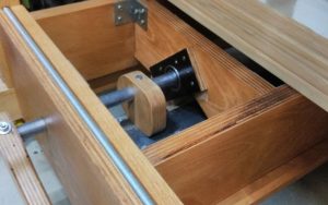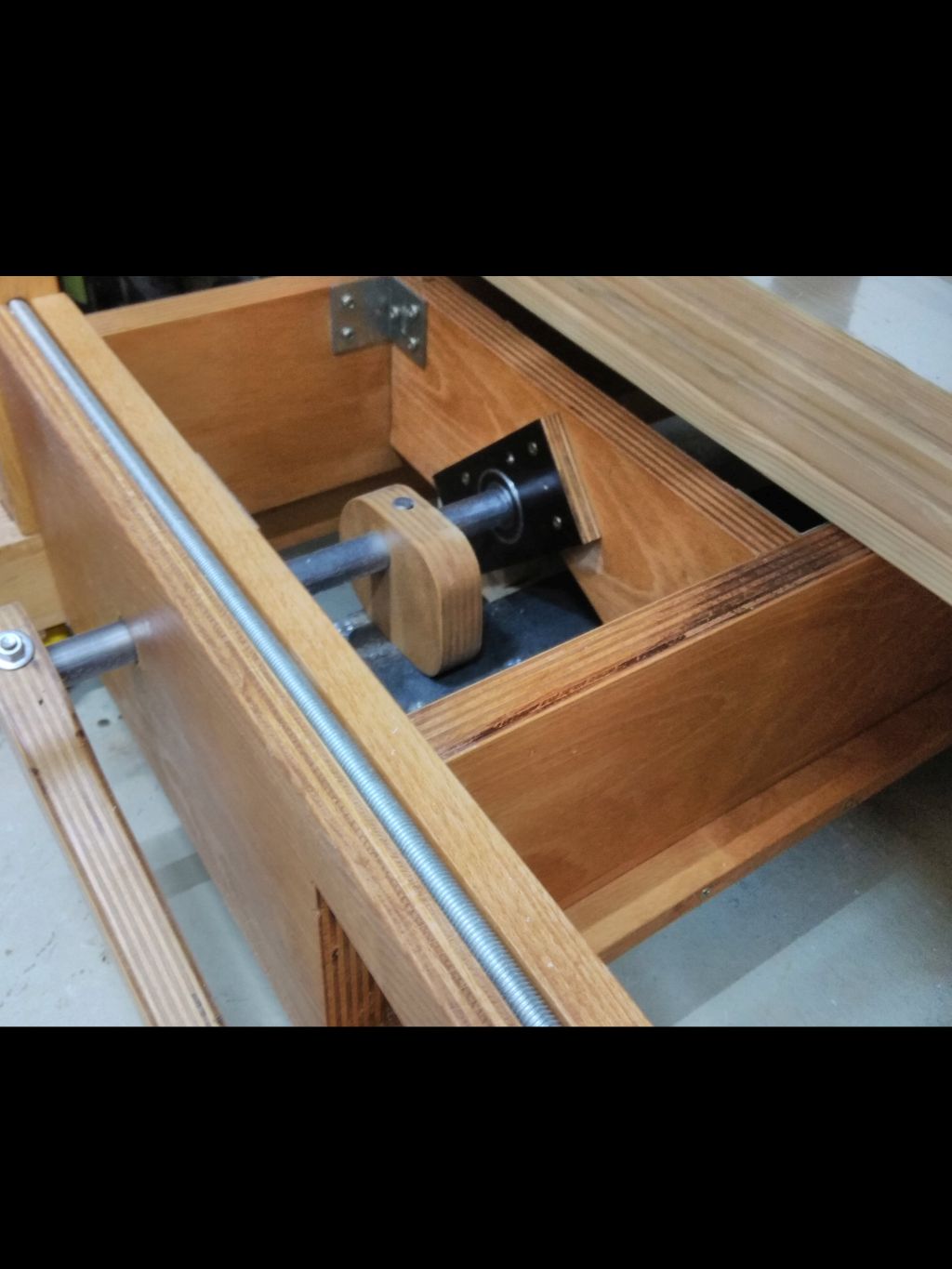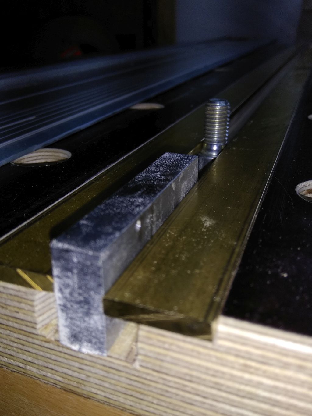 Mit einer Schablone dann das Bohrbild im System 19 mit 96mm Abstandgebohrt. Eine selbstgemachte Fräsplatte aus 12mm Aluguss und eine passende T-Nut Schiene eingelassen, welche so dimensioniert ist, dass eine M8 Schraube passt. Die Arbeitsplatte mal schnell beiseite gestellt und mit dem Gestell begonnen. Nachdem der Grundrahmen mit den Beinen verbunden ist, geht es an die Absenkbaren Rollen. Eine mittels Exzenterscheiben betätigte Wippe drückt die Werkbank hoch. Das Ganze habe mit Rundstahl Durchmesser 20 und passenden Rillenkugellagern gelöst ( 5 Jahre später – funktioniert noch 🙂 ) .